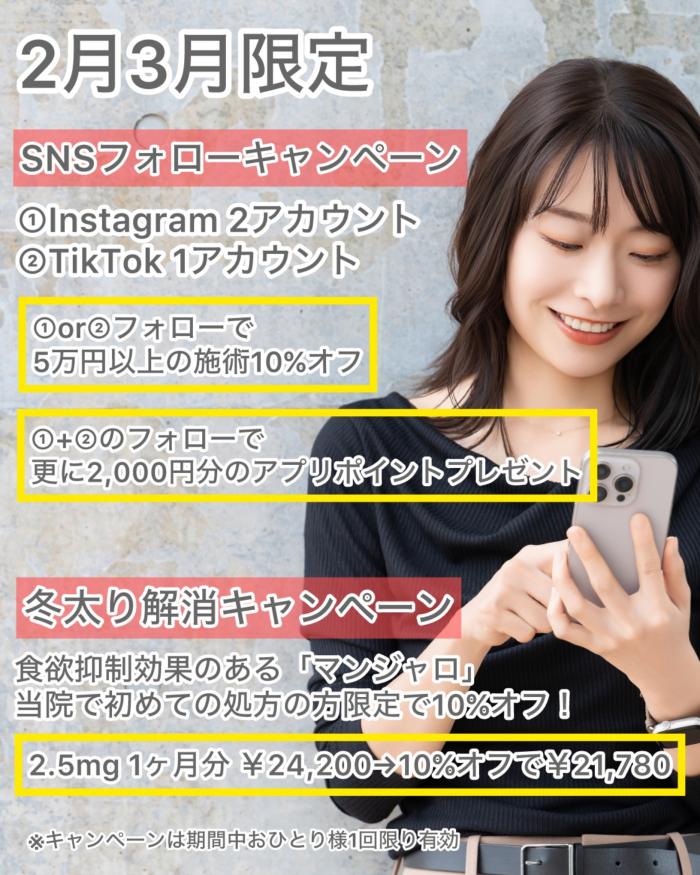 ★① or ②のフォロー画面ご提示で、5万円以上の施術が10%オフ!